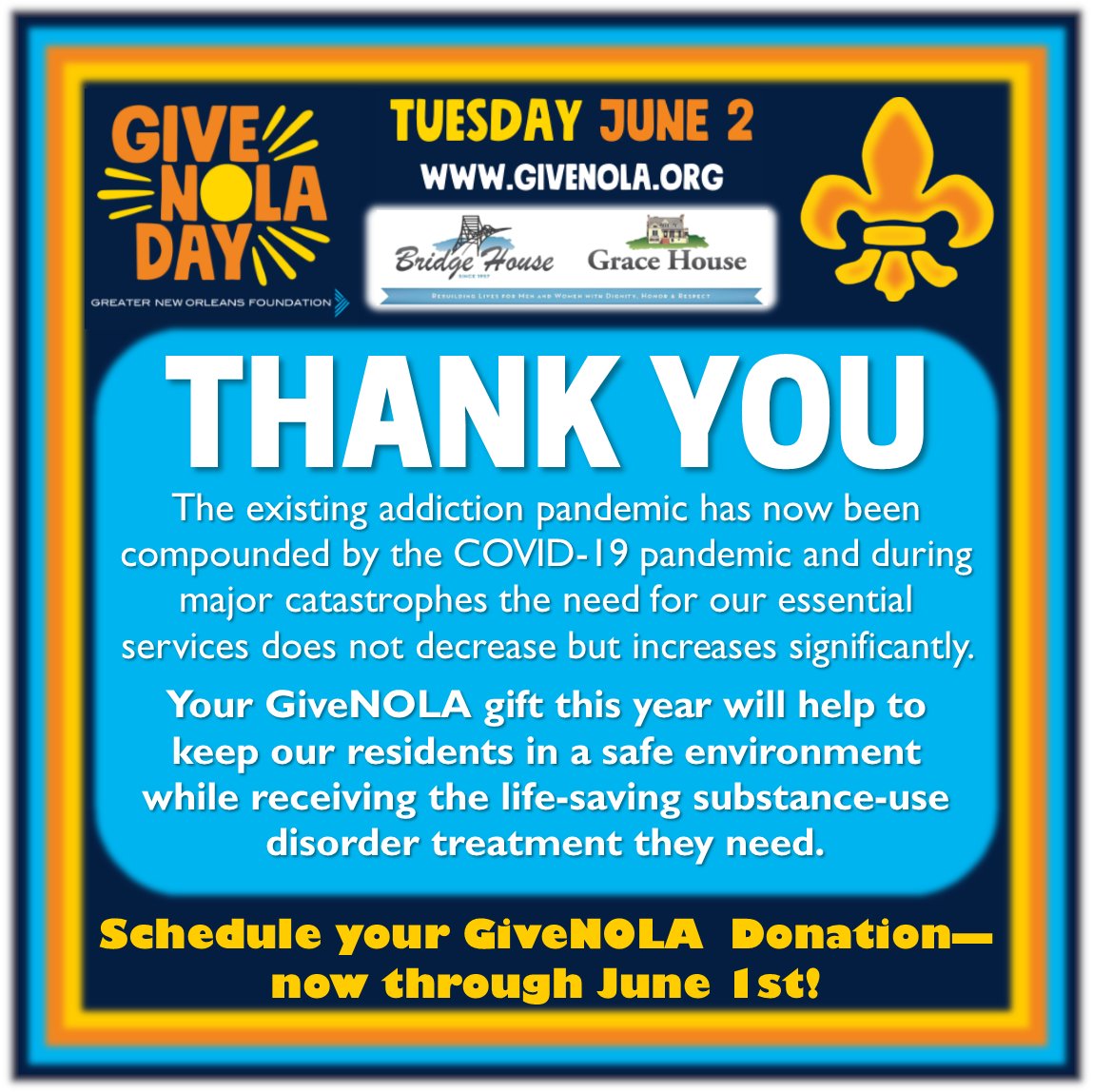 All funds benefit Bridge House Grace. 1160 Camp Street New Orleans LA 70130. 4243 Earhart Blvd New Orleans LA 70125.
